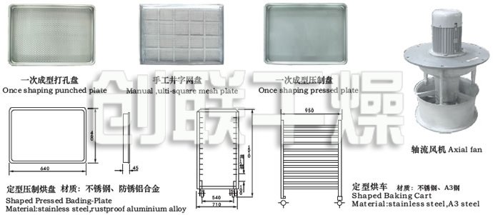 ◎本廠出廠烘車、烘盤尺寸統(tǒng)一,可以互換;