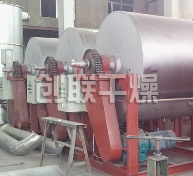 滾筒干燥機是一種內加熱傳導型轉動連續干燥設備。旋轉的滾筒通過其下部料槽,粘附著一厚度的料膜,熱量通過管道輸送至滾筒內壁,傳導到滾筒外壁,再傳導給料膜,使料膜中的濕得到蒸發、脫濕、使含濕分的物料得到干燥。干燥好的物料被裝置在滾筒表面的刮刀鏟離滾筒,到置于刮刀下方的螺旋輸送器,通過螺旋輸送器將干物料集中、包裝。