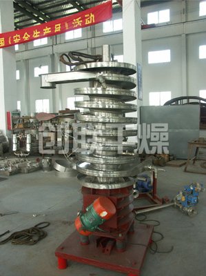 濕物料自頂部加料口進(jìn)入螺旋床內(nèi),在周向激振力及重力的作用下,物料沿螺旋床自上而下作跳躍運(yùn)動(dòng)直至最底層;同時(shí),潔凈的熱風(fēng)由螺旋床底部進(jìn)入,與分布在床上的物料進(jìn)行充分的傳熱和傳質(zhì)后,由頂部排濕口排出。從而使物料達(dá)到了干燥的目的。