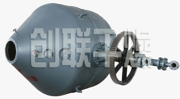 本機設計為雙錐形罐體,一頭為過濾板,另一頭為淋洗及出料口,夾套內可通入蒸汽或熱水對內膽進行加熱。罐體通過主軸置于兩側機架上。主軸兩端一頭為蒸汽及冷凝水接口,通入蒸汽完成加熱過程,另一頭為抽真空口,通過真空泵或真空系統,使罐內呈真空狀態,完成抽濾過程,并在干燥過程中抽走蒸發出來的水汽。電機和減速機也置于機架內,通過齒輪傳動,帶動罐體正反轉,使物料不斷上下、內外翻動。在洗滌過程中可使物料充分均勻混合,徹底完成洗滌過程。在干燥過程中,可不斷地更換受熱面,使物料受熱均勻,達到均衡干燥的目的。
